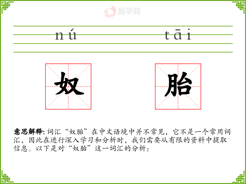 词汇“奴胎”在中文语境中并不常见,它不是一个常用词汇,因此在进行深入学习和分析时,我们需要从有限的资料中提取信息。以下是对“奴胎”这一词汇的分析:
