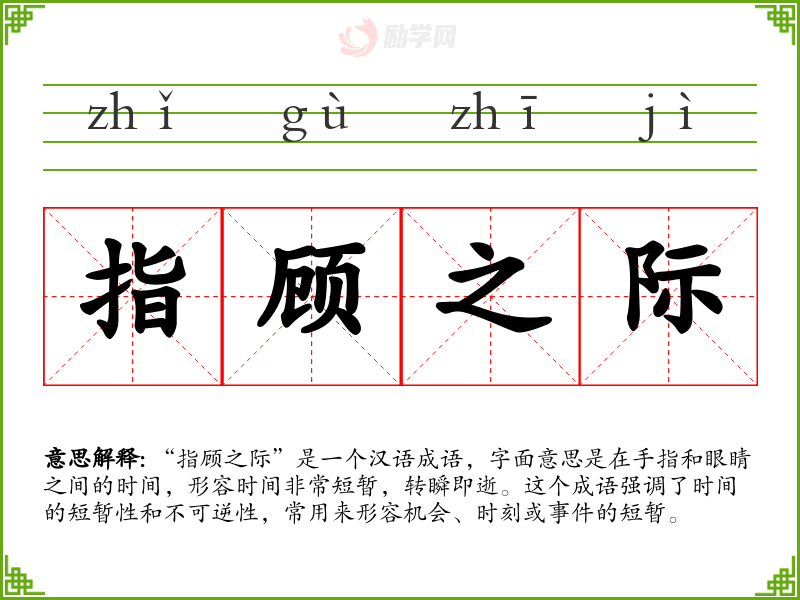 在文学作品中,“指顾之际”常用来描绘那些稍纵即逝的美好瞬间,如爱情、友情或自然美景。在口语中,这个成语可能不太常用,但在正式的演讲或写作中,它可以用来强调时间的宝贵和不可重复。在专业领域,如哲学或时间管理,这个成语可以用来讨论时间的本质和价值。