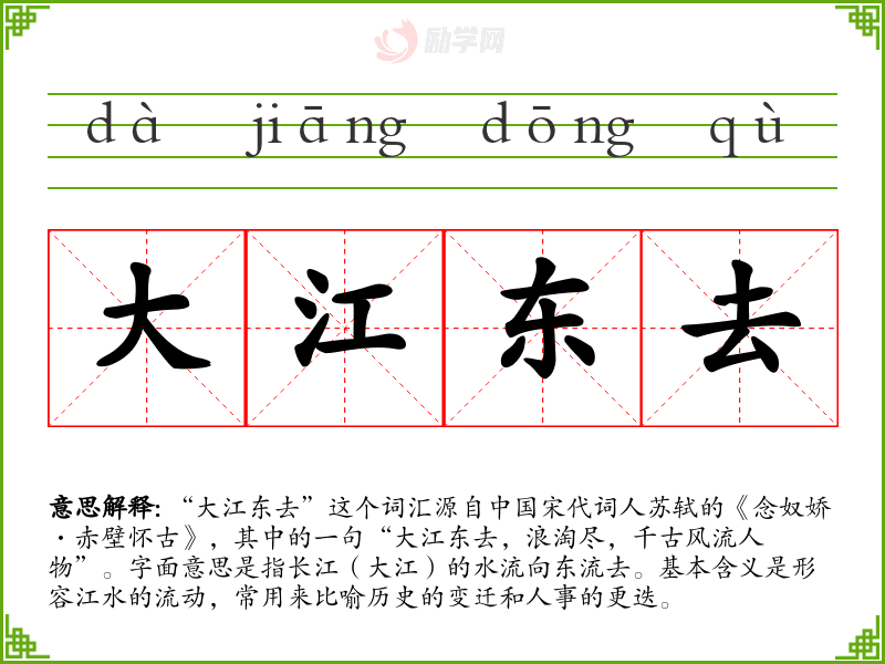 大江东去的意思是:长江的水往东奔流而去。后借用为词牌名。多表示陈迹消逝,历史向前发展。