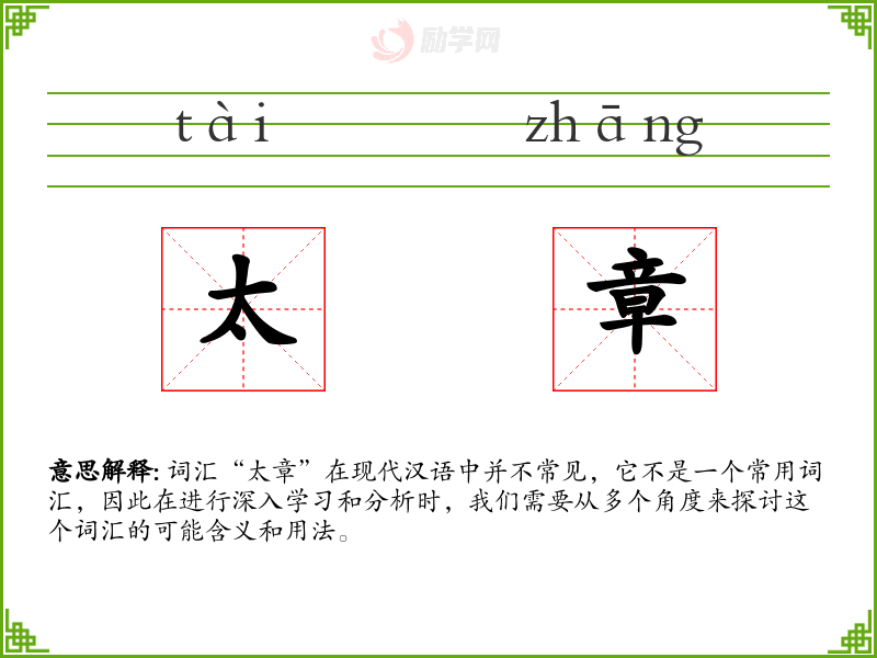 词汇“太章”在现代汉语中并不常见,它不是一个常用词汇,因此在进行深入学*和分析时,我们需要从多个角度来探讨这个词汇的可能含义和用法。