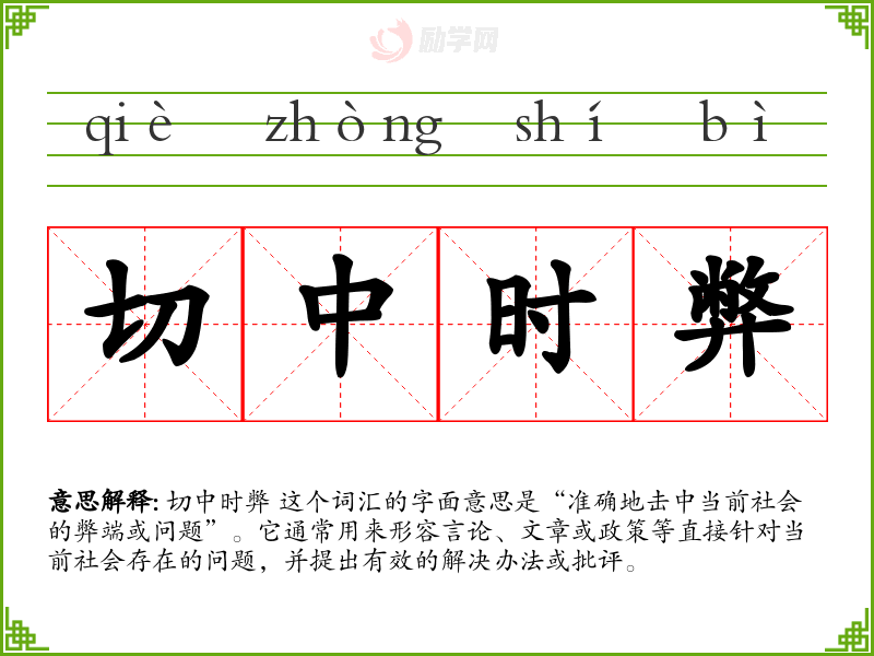 切中时弊 这个词汇的字面意思是“准确地击中当前社会的弊端或问题”。它通常用来形容言论、文章或政策等直接针对当前社会存在的问题,并提出有效的解决办法或批评。