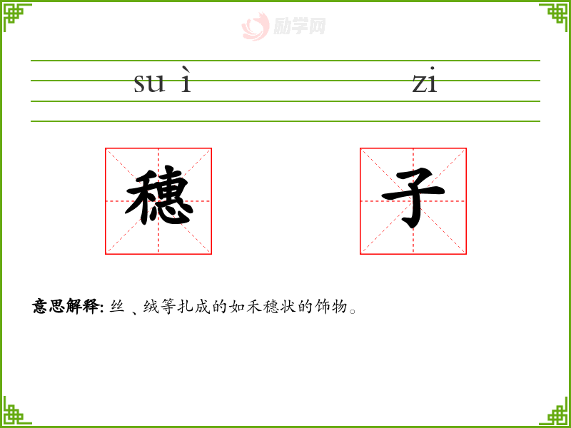 穗子的意思是:丝﹑绒等扎成的如禾穗状的饰物。