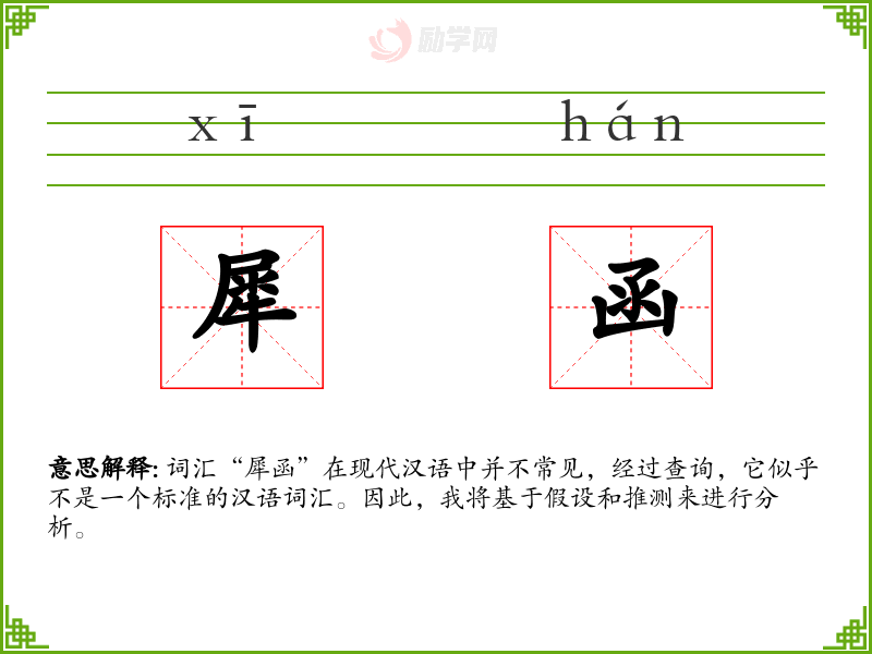 词汇“犀函”在现代汉语中并不常见,经过查询,它似乎不是一个标准的汉语词汇。因此,我将基于假设和推测来进行分析。