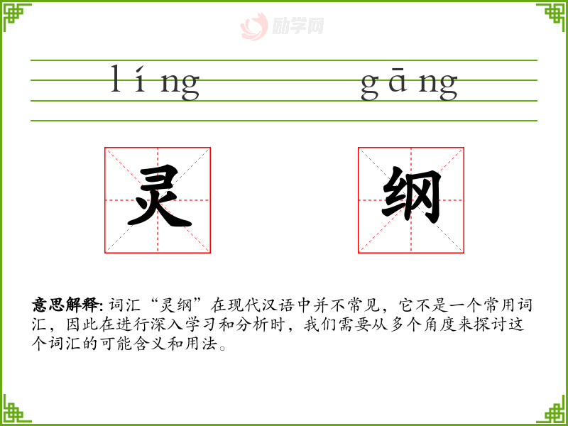 词汇“灵纲”在现代汉语中并不常见,它不是一个常用词汇,因此在进行深入学*和分析时,我们需要从多个角度来探讨这个词汇的可能含义和用法。