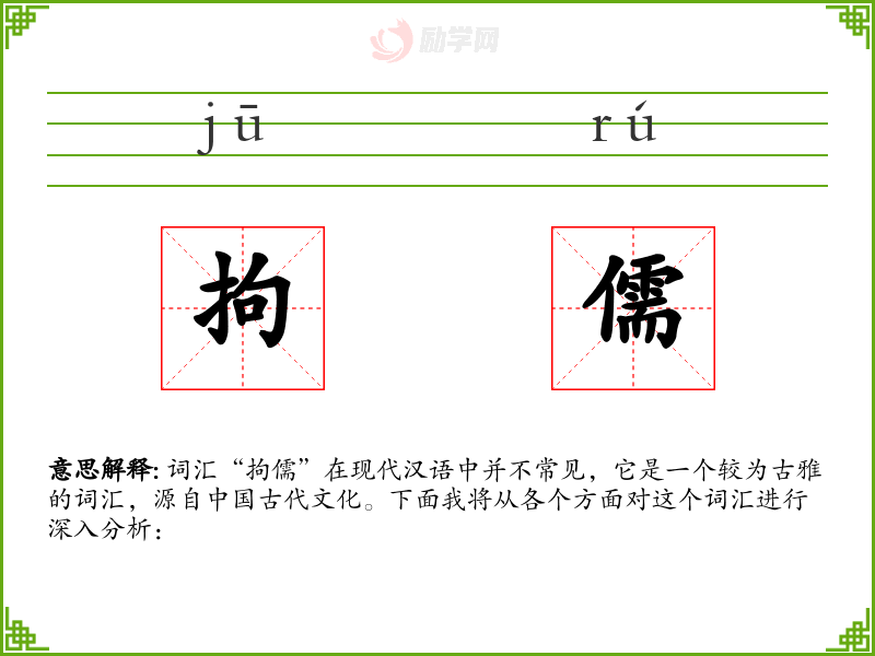 词汇“拘儒”在现代汉语中并不常见,它是一个较为古雅的词汇,源自**古代文化。下面我将从各个方面对这个词汇进行深入分析: