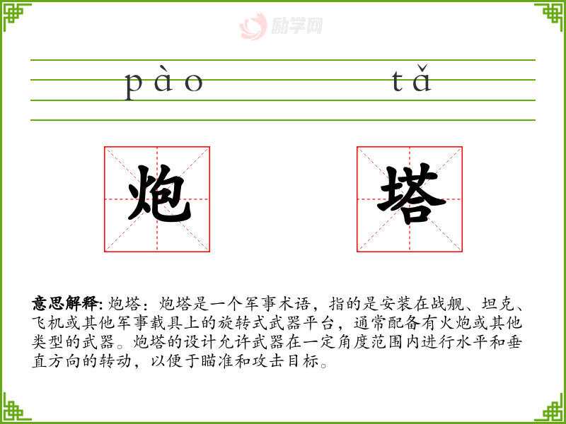 炮塔作为一个军事术语,不仅体现了武器技术的发展,也承载了丰富的历史和文化意义。在语言学*和表达中,了解炮塔的背景和用法,有助于我们更准确地理解和使用相关词汇,丰富我们的语言表达能力。