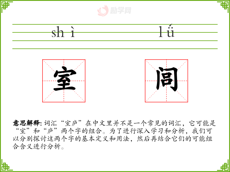 - 在英语中,“室”可以对应为“room”,“庐”则可能对应为“cottage”或“hut”。