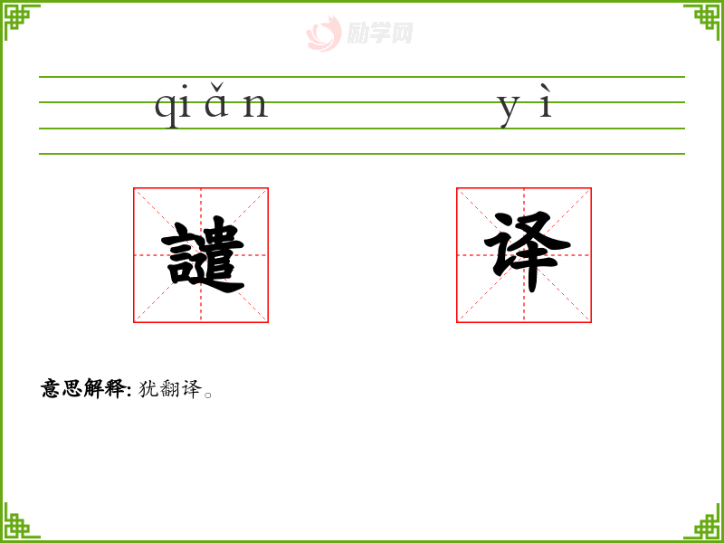 译[ yì ] 1. (形声。从言,睪(yì)声。本义:翻译,把一种语言文字翻译成另一种语言文字)。 2. 同本义。 【引证】 《说文》-译,传译四夷之言者。 《方言十三》-译,传也。 《礼记·王制》-北方曰译。 张衡《东京赋》-重舌之人九译。 清·薛福成《观巴黎油画记》-译者称西人。 清·梁启超《谭嗣同传》-译欧西人之言。 【组词】 汉语被译成日语;译品、 译义、 译写、 译经 [更多解释]