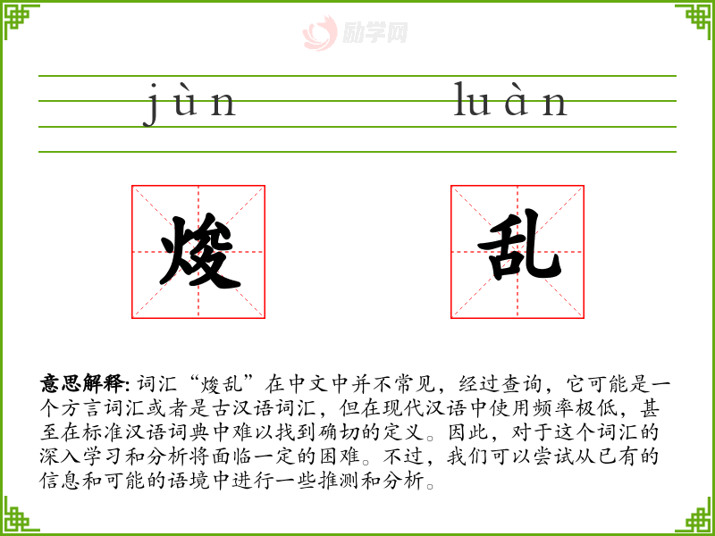 由于“焌乱”在现代汉语中不常见,对其进行深入学习和分析存在较大困难。在语言学习和表达中,了解和掌握常用词汇更为重要。对于这类罕见词汇,了解其可能的含义和使用环境即可,不必过度深入。