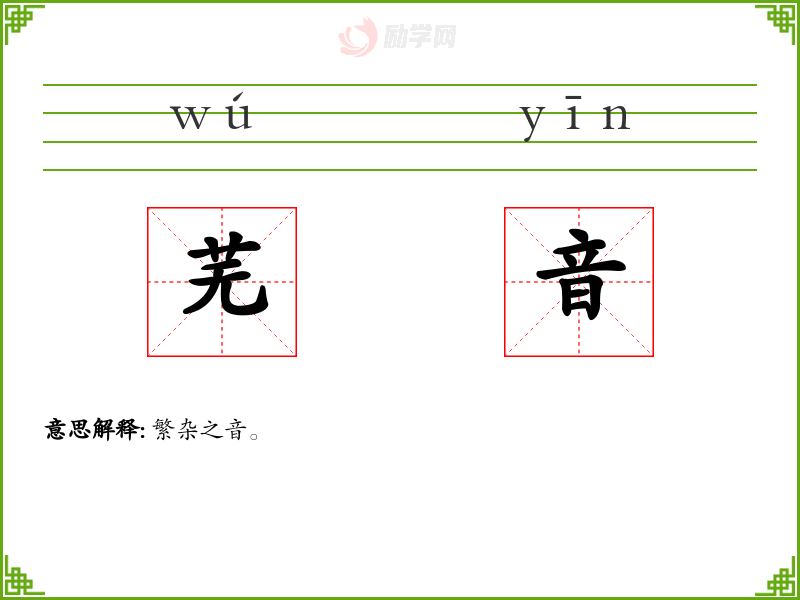 《说文》-音,声也。生于心,有节于外。谓之音。 《白虎通·礼乐》-八音。一说笙、祝、鼓、箫、琴、埙、钟、磬也。 《礼记·乐记》-凡音之起,由人心生也。声成文,谓之音。 《左传·昭公二十一年》-夫音,乐之舆也。 《庄子》-鸡狗之音相闻。 宋·苏轼《石钟山记》-北音清越。 清·姚鼐《登泰山记》-鸟兽音迹。