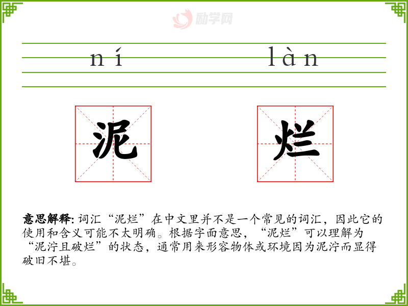 词汇“泥烂”在中文里并不是一个常见的词汇,因此它的使用和含义可能不太明确。根据字面意思,“泥烂”可以理解为“泥泞且破烂”的状态,通常用来形容物体或环境因为泥泞而显得破旧不堪。