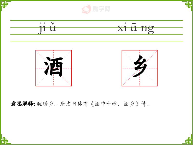 酒乡的意思是:犹醉乡。唐皮日休有《酒中十咏.酒乡》诗。