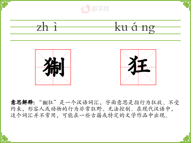 “猘狂”是一个汉语词汇,字面意思是指行为狂放、不受约束,形容人或动物的行为非常狂野、无法控制。在现代汉语中,这个词汇并不常用,可能在一些古籍或特定的文学作品中出现。