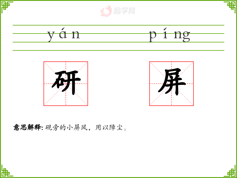 研屏的意思是:砚旁的小屏风,用以障尘。