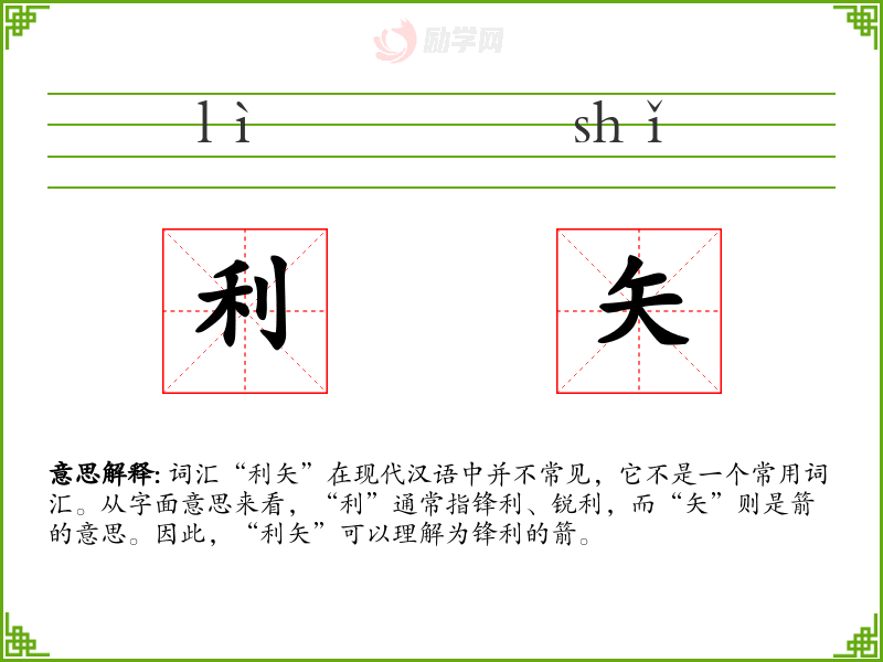 “利矢”作为一个词汇,虽然在现代汉语中不常用,但它蕴含了丰富的文化和历史意义。在学*和使用这个词汇时,可以更好地理解古代战争和武器的文化背景,以及如何在现代语境中运用比喻来增强表达的效果。
