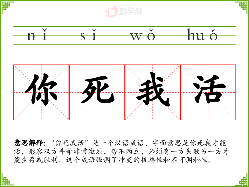 “你死我活”是一个汉语成语,字面意思是你死我才能活,形容双方斗争非常激烈,势不两立,必须有一方失败另一方才能生存或胜利。这个成语强调了冲突的极端性和不可调和性。