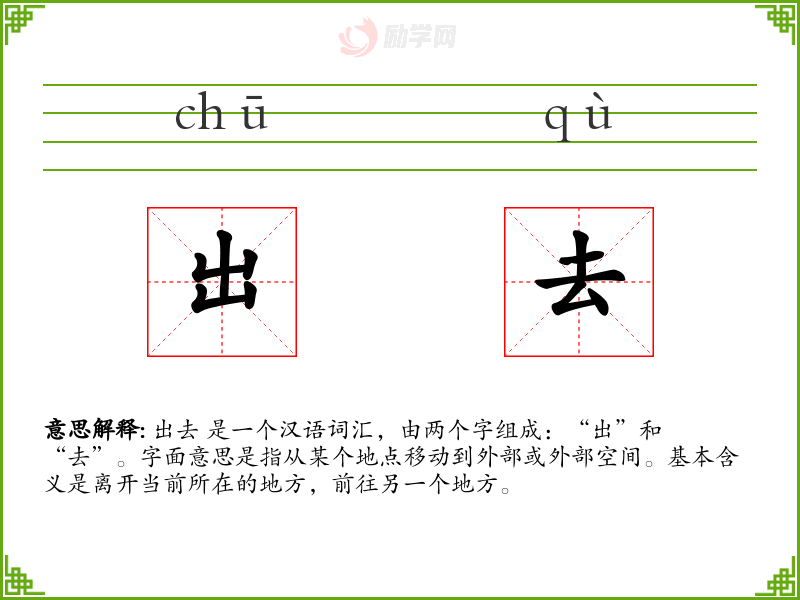出去 是一个汉语词汇,由两个字组成:“出”和“去”。字面意思是指从某个地点移动到外部或外部空间。基本含义是离开当前所在的地方,前往另一个地方。