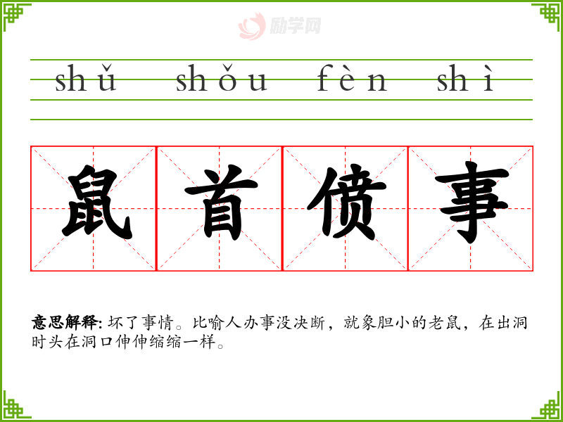 鼠首偾事的意思是:坏了事情。比喻人办事没决断,就象胆小的老鼠,在出洞时头在洞口伸伸缩缩一样。