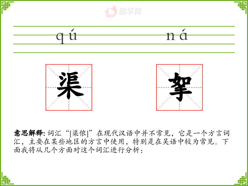 词汇“[渠侬]”在现代汉语中并不常见,它是一个方言词汇,主要在某些地区的方言中使用,特别是在吴语中较为常见。下面我将从几个方面对这个词汇进行分析: