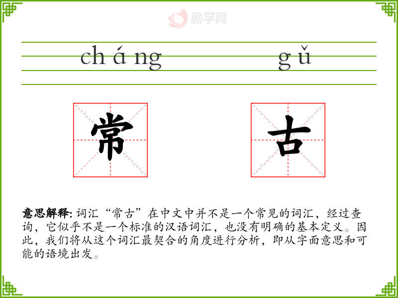 词汇“常古”在中文中并不是一个常见的词汇,经过查询,它似乎不是一个标准的汉语词汇,也没有明确的基本定义。因此,我们将从这个词汇最契合的角度进行分析,即从字面意思和可能的语境出发。