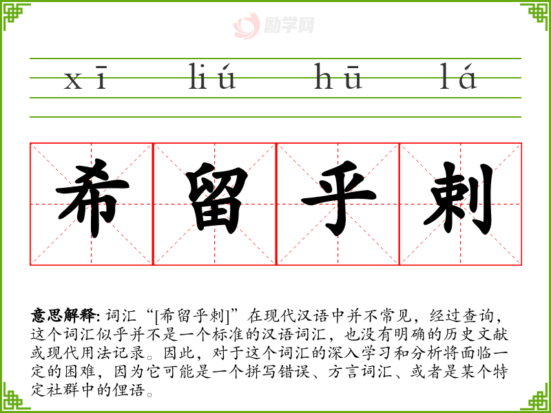 词汇“[希留乎剌]”在现代汉语中并不常见,经过查询,这个词汇似乎并不是一个标准的汉语词汇,也没有明确的历史文献或现代用法记录。因此,对于这个词汇的深入学习和分析将面临一定的困难,因为它可能是一个拼写错误、方言词汇、或者是某个特定社群中的俚语。
