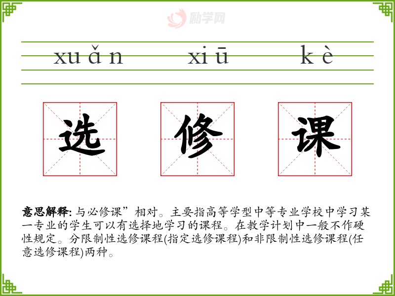与必修课”相对。主要指高等学型中等专业学校中学习某一专业的学生可以有选择地学习的课程。在教学计划中一般不作硬性规定。分限制性选修课程(指定选修课程)和非限制性选修课程(任意选修课程)两种。