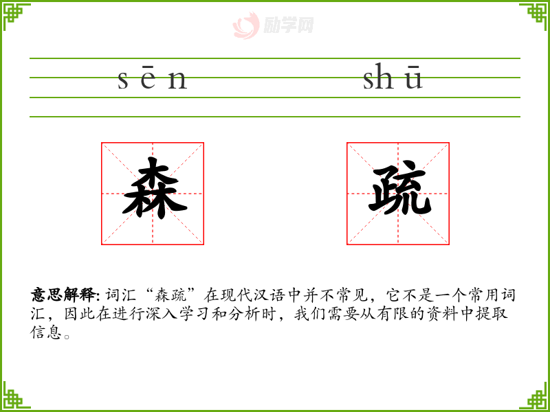 词汇“森疏”在现代汉语中并不常见,它不是一个常用词汇,因此在进行深入学*和分析时,我们需要从有限的资料中提取信息。