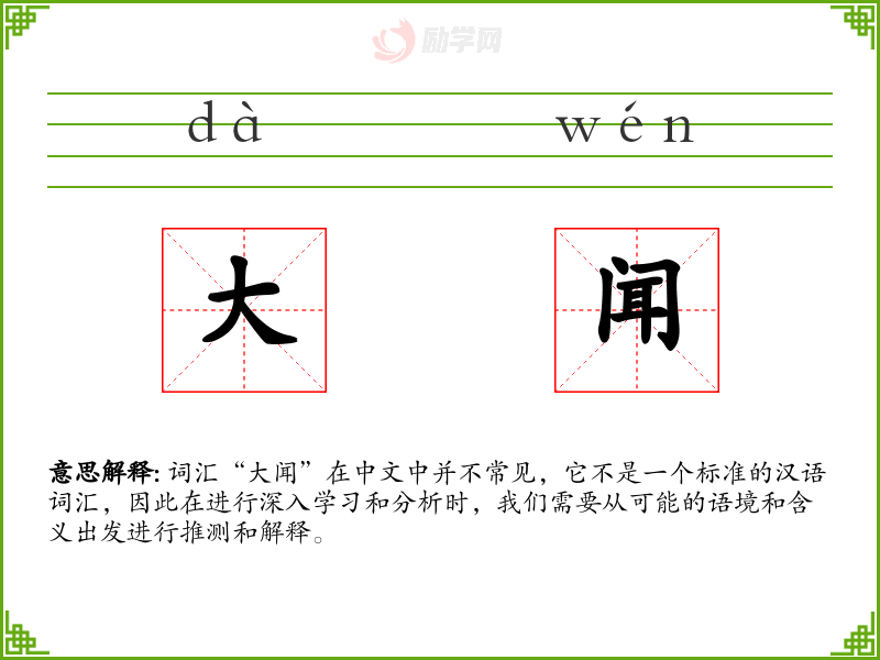 词汇“大闻”在中文中并不常见,它不是一个标准的汉语词汇,因此在进行深入学*和分析时,我们需要从可能的语境和含义出发进行推测和解释。
