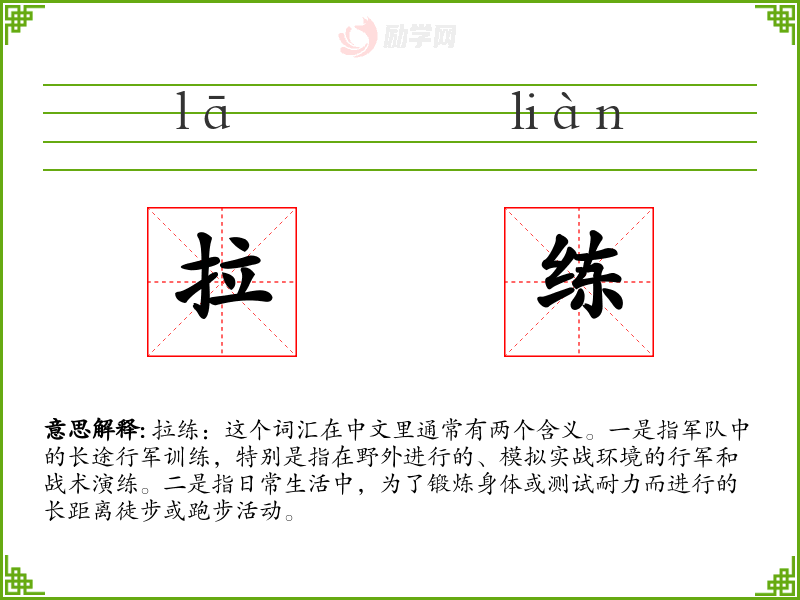 拉练:这个词汇在中文里通常有两个含义。一是指军队中的长途行军训练,特别是指在野外进行的、模拟实战环境的行军和战术演练。二是指日常生活中,为了锻炼身体或测试耐力而进行的长距离徒步或跑步活动。