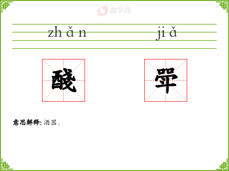 醆[ zhǎn ] 1. “别时酒~照灯花。”。 [更多解释]