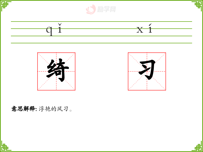 习[ xí ] 1. (会意。从羽 。从羽,与鸟飞有关。本义:小鸟反复地试飞)。 2. 同本义。 【引证】 《说文》-習,数飞也。 《礼记·月令》-鹰乃学习。 晋·左思《咏史》-习习笼中鸟,举翮触四隅。 [更多解释]