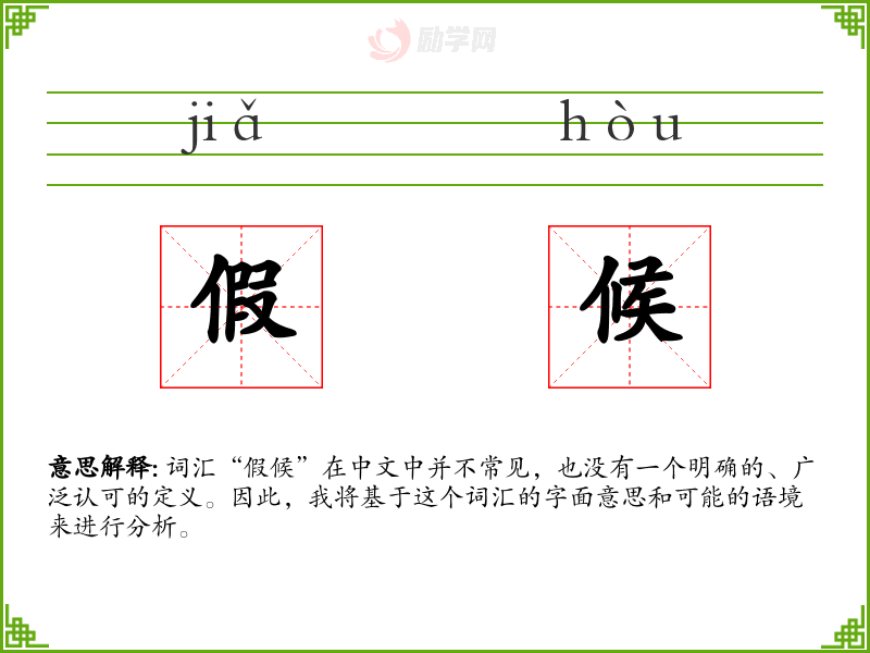 词汇“假候”在中文中并不常见,也没有一个明确的、广泛认可的定义。因此,我将基于这个词汇的字面意思和可能的语境来进行分析。