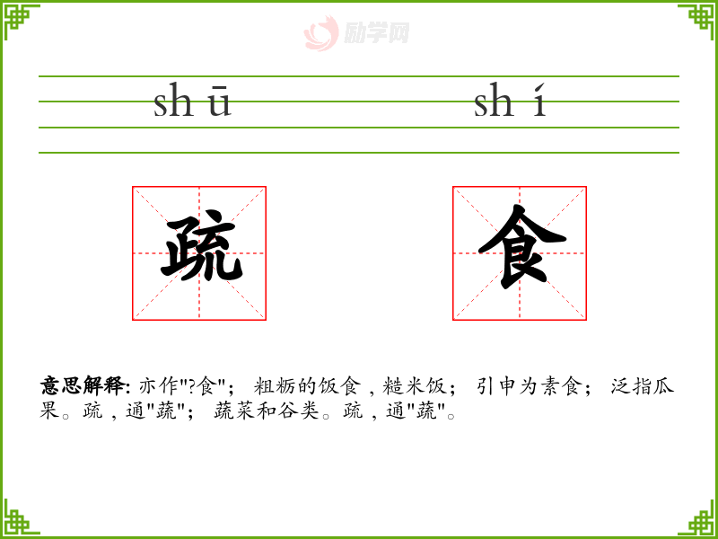 疏食的意思是:亦作"?食"; 粗粝的饭食﹐糙米饭; 引申为素食; 泛指瓜果。疏﹐通"蔬"; 蔬菜和谷类。疏﹐通"蔬"。