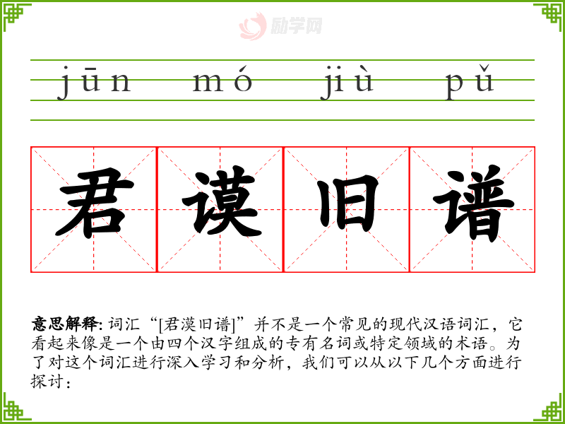 词汇“[君漠旧谱]”并不是一个常见的现代汉语词汇,它看起来像是一个由四个汉字组成的专有名词或特定领域的术语。为了对这个词汇进行深入学*和分析,我们可以从以下几个方面进行探讨: