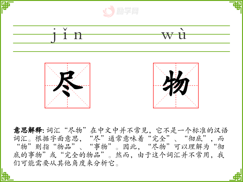 词汇“尽物”在中文中并不常见,它不是一个标准的汉语词汇。根据字面意思,“尽”通常意味着“完全”、“彻底”,而“物”则指“物品”、“事物”。因此,“尽物”可以理解为“彻底的事物”或“完全的物品”。然而,由于这个词汇并不常用,我们可能需要从其他角度来分析它。