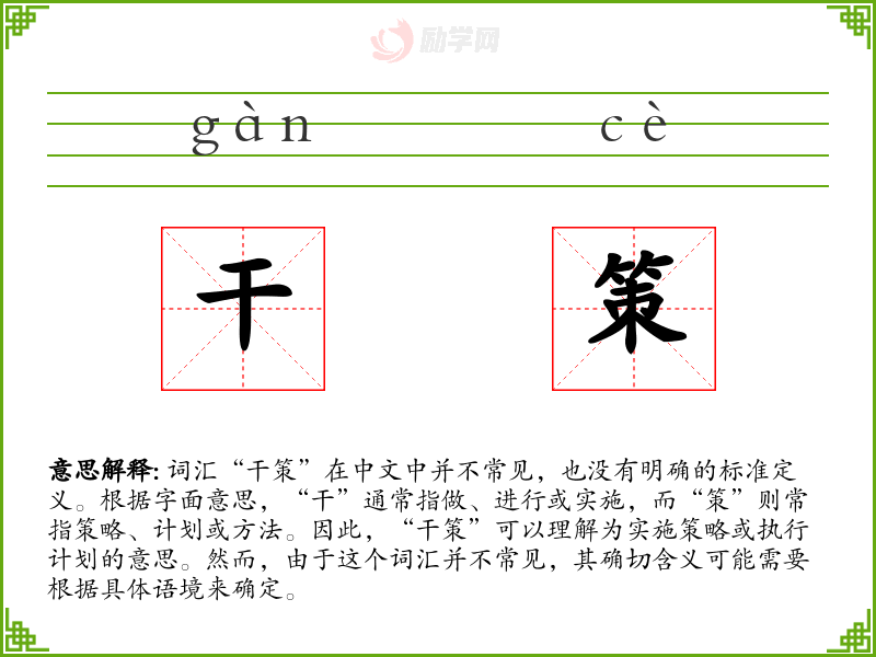 “干策”这个词虽然不常见,但它强调了策略的实施和执行,这在任何需要行动和结果的领域都是非常重要的。在我的语言学习和表达中,理解并适当使用这样的词汇可以增强我的表达能力和专业性。