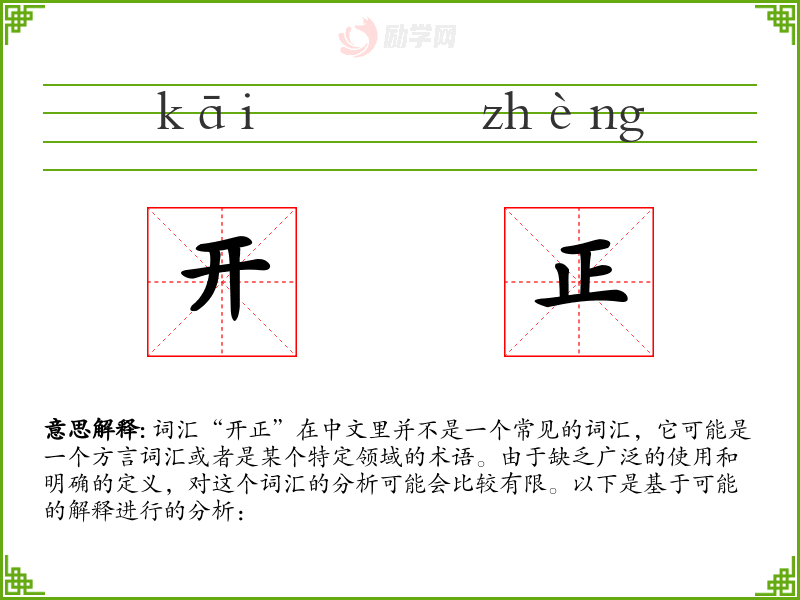由于“开正”不是一个标准的中文词汇,它的使用可能局限于特定的地区或行业。在文学作品中,如果出现这个词,可能是为了表现地方特色或行业术语。