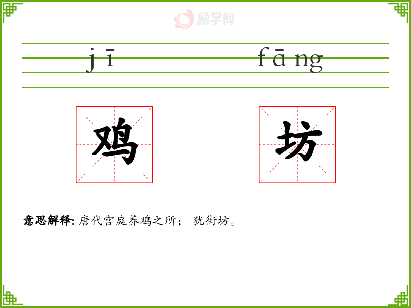 鸡坊的意思是:唐代宫庭养鸡之所; 犹街坊。
