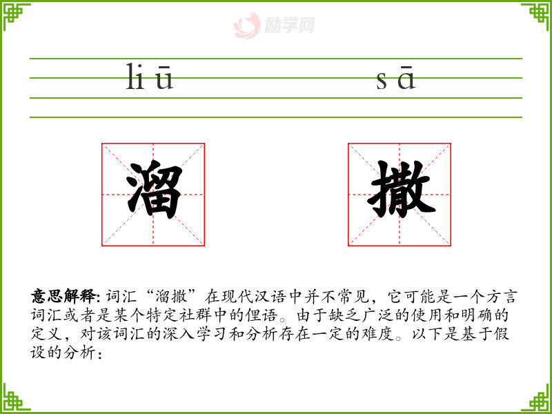 假设“溜撒”是一个方言词汇,它的字面意思可能是指“迅速离开”或“逃走”。在某些方言中,“溜”可以表示悄悄地走开,“撒”则可能表示放开或离开。