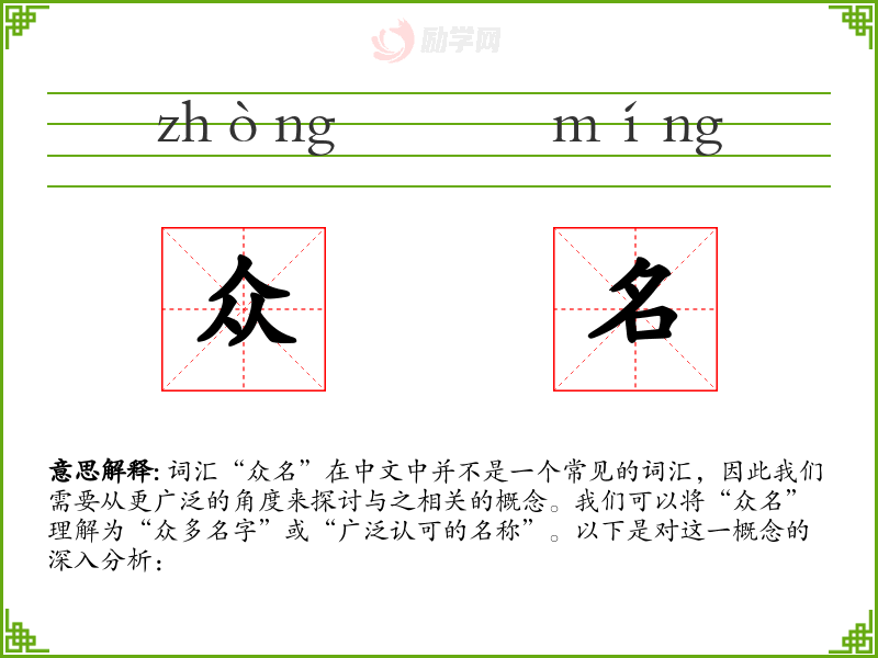 由于“众名”不是一个常用词汇,其词源和演变不太明确。但可以推测,它可能是由“众”和“名”两个字组合而成,表示多个名字或称谓。