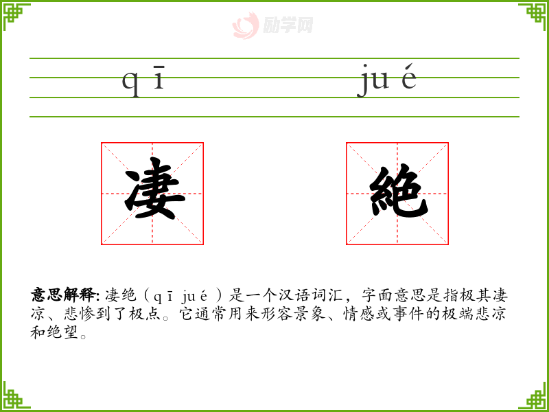 凄绝(qī jué)是一个汉语词汇,字面意思是指极其凄凉、悲惨到了极点。它通常用来形容景象、情感或**的极端悲凉和绝望。