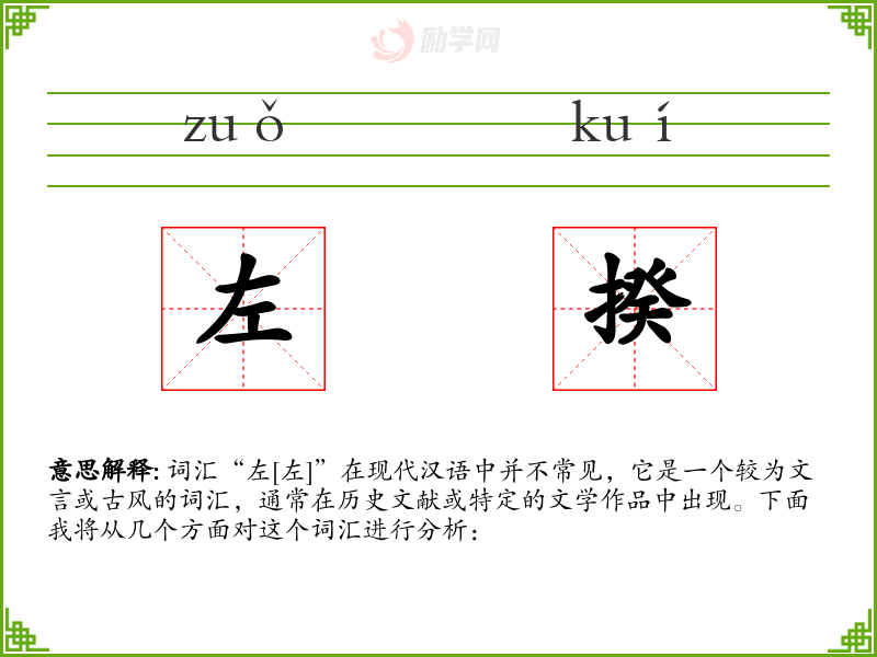词汇“左[左]”在现代汉语中并不常见,它是一个较为文言或古风的词汇,通常在历史文献或特定的文学作品中出现。下面我将从几个方面对这个词汇进行分析: