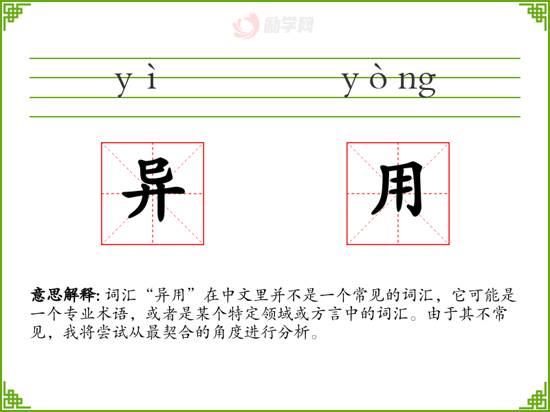 由于“异用”不是一个标准词汇,我们无法给出一个确切的基本定义。它可能是指“不同的使用”或“异常的使用”,但这只是基于字面意思的猜测。