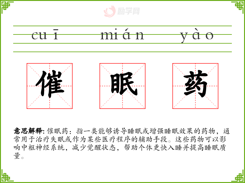 - 同义词:安眠药、镇静剂、助眠药。这些词汇都指能够帮助睡眠的药物,但在具体用途和效果上可能有所不同。