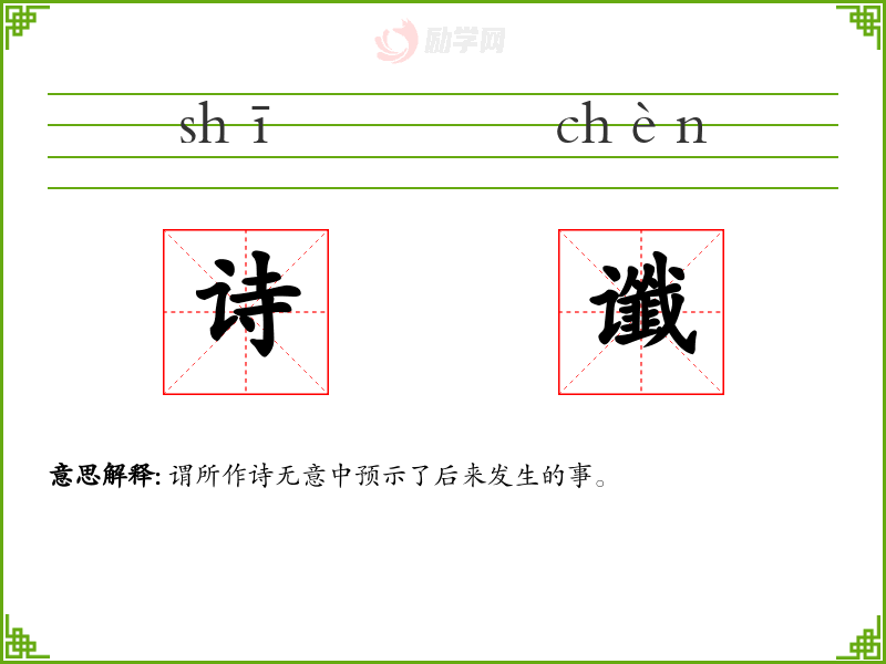 诗谶的意思是:谓所作诗无意中预示了后来发生的事。