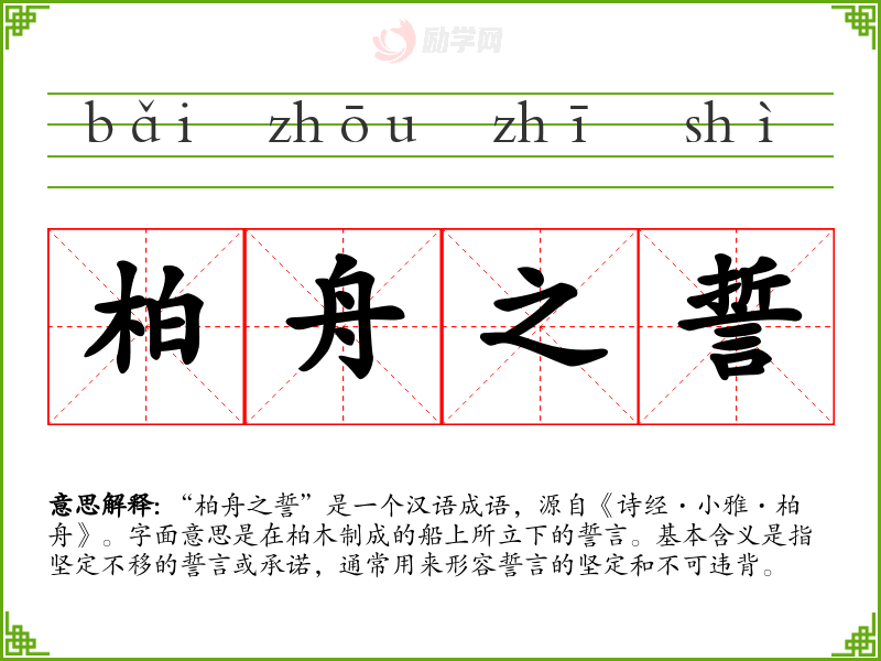 “柏舟之誓”是一个汉语成语,源自《诗经·小雅·柏舟》。字面意思是在柏木制成的船上所立下的誓言。基本含义是指坚定不移的誓言或承诺,通常用来形容誓言的坚定和不可违背。