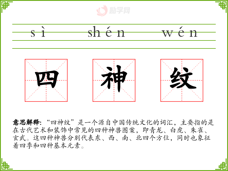 通过对“四神纹”的深入学*,我更加理解了它在中华文化中的重要地位和深远影响。这个词汇不仅丰富了我的语言知识,也增强了我对**传统文化的认识和尊重。