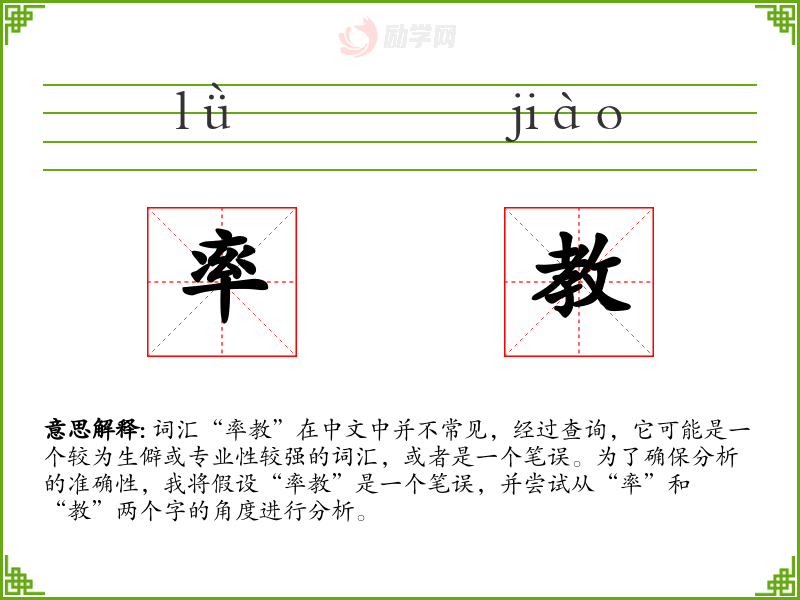 词汇“率教”在中文中并不常见,经过查询,它可能是一个较为生僻或专业性较强的词汇,或者是一个笔误。为了确保分析的准确性,我将假设“率教”是一个笔误,并尝试从“率”和“教”两个字的角度进行分析。