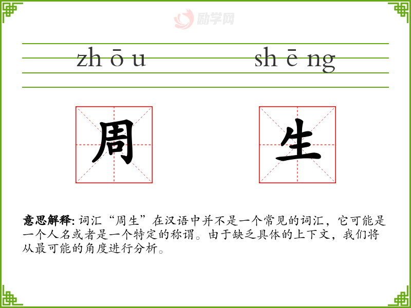 词汇“周生”在汉语中并不是一个常见的词汇,它可能是一个人名或者是一个特定的称谓。由于缺乏具体的上下文,我们将从最可能的角度进行分析。