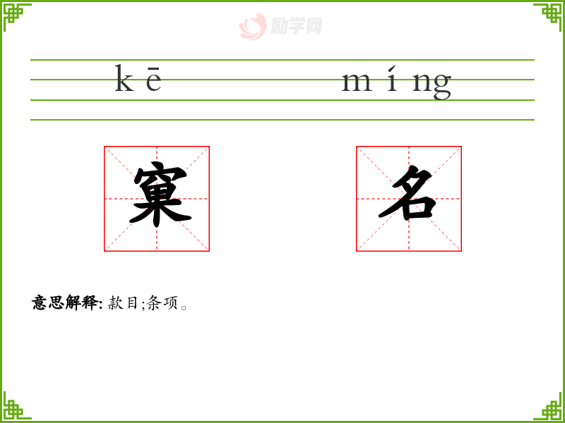 《说文》-名,自命也。 《礼记·祭法》-黄帝正名百物。 《孟子》-名之曰幽厉。 《庄子·天运》-名公器也。 《乐府诗集》-秦氏有好女,自名为罗敷。 宋·王安石《游褒禅山记》-以故其后名之曰“褒禅”。 宋·欧阳修《醉翁亭记》-名之者谁。 《聊斋志异·促织》-自名“蟹壳青”。